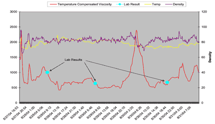 巴西的Petrobras公司進(jìn)行了實(shí)地試驗(yàn),跟蹤運(yùn)動學(xué)粘度(即組合測量絕對粘度和密度)和溫度。結(jié)果讓人印象深刻, 第一次該公司可以很容易的看到在他們的過程中發(fā)生了什么。